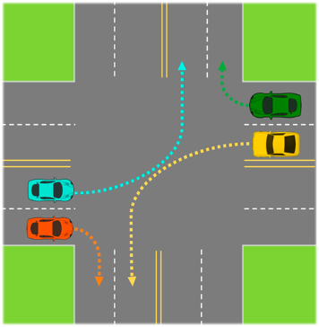Look at the blue car turning left on the picture above. It is turning into the near lane or left traveling lane. So many drivers turning left immediately go into the right traveling lane because they intend to be the right lane further down the road. However, as you can see, the green car may see the blue car turning and decide they also can turn. If the blue vehicle goes to the far lane, there will be a crash.